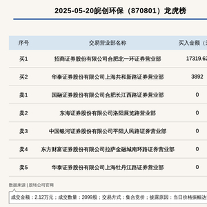 据每日经济新闻消息,2025年5月20日,新三板创新层公司皖创环保(870801,收盘价:12.38元)登上龙虎榜,交易方式是集合竞价,披露原因是当日价格振幅达到122.66%,成交数量2099股,成交金额2.12万元。买一席位为招商证券股份有限公司合肥北一环证券营业部,买入1.73万元;卖一席位为国融证券股份有限公司合肥长江西路证券营业部,卖出1.3万元。