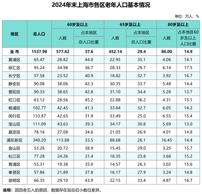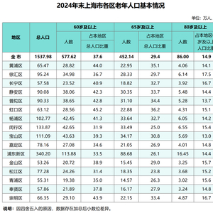 截至2024年末,上海户籍人口1538万人,其中60岁及以上人口577.6万人,占比37.6%;65岁以上452万人,占比29.4%。