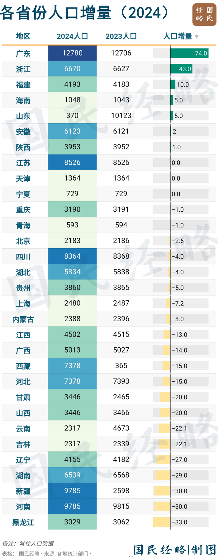 根据《20多个省,人口负增长》一文,2024年内地31个省份中,只有8省人口正增长、3省零增长,近2/3省份都是负增长。