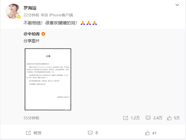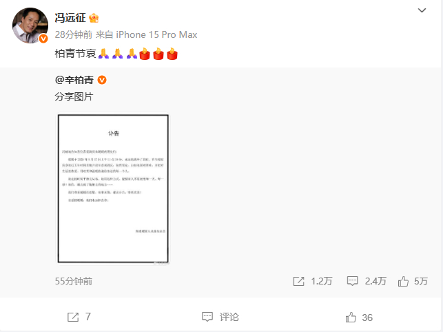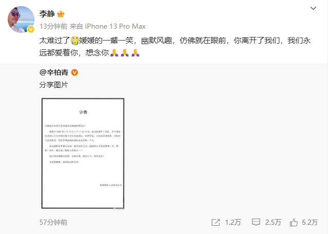 5月21日,辛柏青发布妻子朱媛媛去世讣告,“媛媛于2025年5月17日上午11点39分,永远地离开了我们。在与癌症抗争的近五年时间里她并没有悲观消沉,依然坚定、自信地面对困难。”