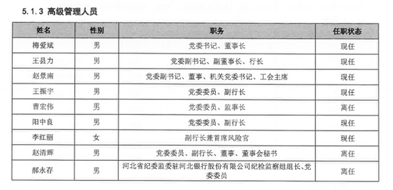 而离任的高管包括监事长曹宏伟、董事会秘书赵清辉、河北省纪委监委驻河北银行股份有限公司纪检监察组组长郝永存。