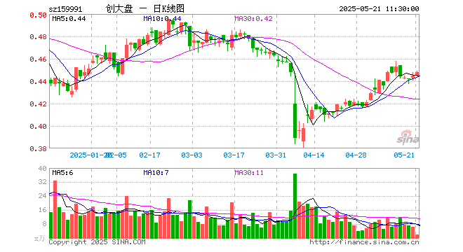 5月21日,截止午间收盘,创大盘ETF(159991)涨0.67%,报0.448元,成交额90.25万元。创大盘ETF(159991)重仓股方面,宁德时代截止午盘涨4.38%,东方财富跌0.09%,汇川技术跌0.22%,迈瑞医疗涨0.87%,阳光电源涨0.55%,中际旭创涨0.35%,新易盛跌0.50%,亿纬锂能涨2.94%,同花顺跌0.41%,爱尔眼科跌0.46%。