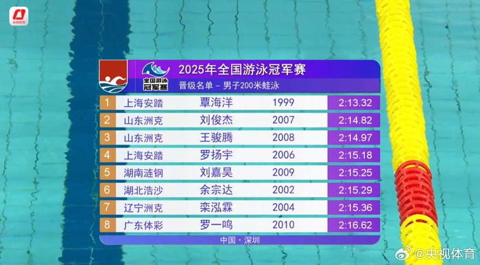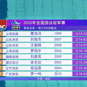 在2025年全国游泳冠军赛男子200米蛙泳预赛中,覃海洋一路领先,最终以2分13秒32的成绩获得预赛第一,成功晋级半决赛。