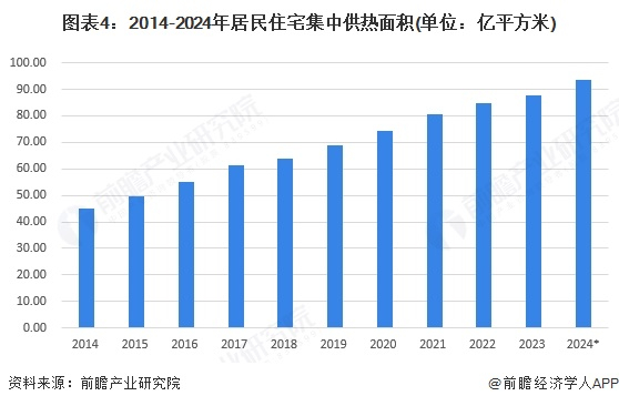 居民住宅集中供热是指在城市或城镇区域内建设集中热源,通过管网将热量输送到居民住宅,满足冬季采暖需求的一种供热方式。集中供热系统主要包括热源、热网和热用户三部分。2014-2024年,我国居民住宅集中供热面积逐年增长。2023年,我国居民住宅集中供热面积为87.75亿平方米,同比增长3.7%。前瞻初步测算,2024年我国居民住宅集中供热面积约为93.68亿平方米。
