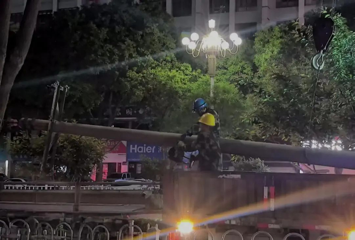 5月10日电线电缆及箱体迁移工作完成后,城关区城市管理局迅速协同国网兰州供电公司启动废弃线杆拆除工作。鉴于中山路、庆阳路大型电力废弃线杆需使用重型机械拆除,且道路车流量、人流量大,为保障拆除作业期间过往车辆和行人安全,将施工作业时间定为每日夜间12点至次日凌晨5点。此外,由于拆除工作涉及多条横跨街道的电力电缆,作业难度大、危险系数高,城关区城市管理局积极对接交警部门,在施工期间对涉及路段实施临时封闭并协助疏导交通。同时,安排工作人员全程跟进现场,积极配合交警部门,有效保障了现场施工安全和施工进度。