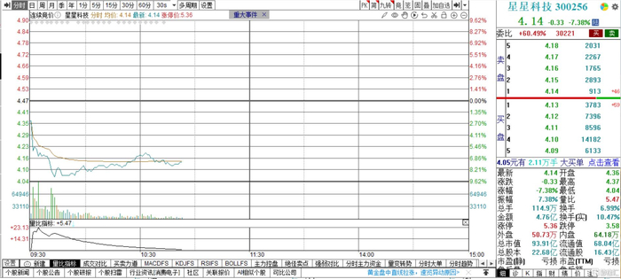 截至发稿,星星科技报4.14元/股,下跌7.38%,总市值为93.91亿元。
