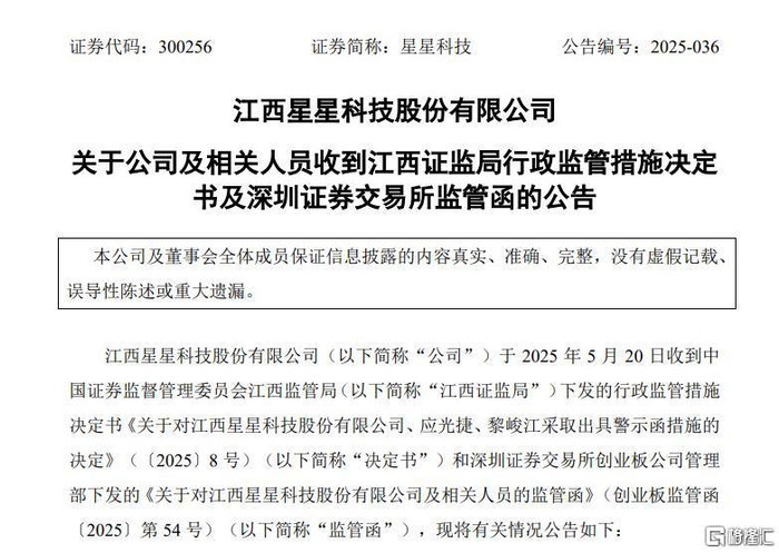 根据公告,星星科技于5月20日收到江西证监局下发的行政监管措施决定书《关于对江西星星科技股份有限公司、应光捷、黎峻江采取出具警示函措施的决定》、深圳证券交易所创业板公司管理部下发的《关于对江西星星科技股份有限公司及相关人员的监管函》。