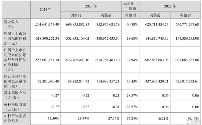 其中,2024年,星星科技实现营收12.02亿元,同比增长40.88%;归母净利润亏损6.19亿元,同比下滑28.68%;扣非净利润亏损5.56亿元,同比下滑7.94%。