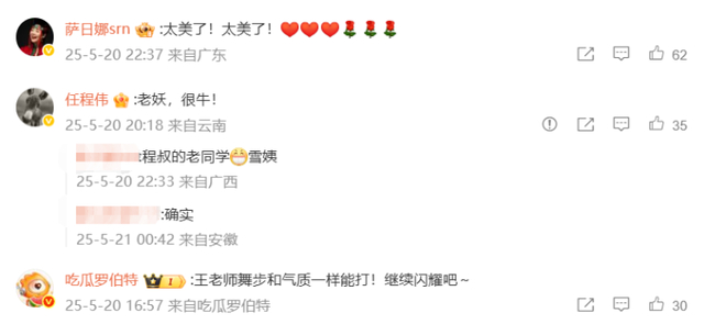 “雪姨”的上海戏剧学院同学、《战长沙》中的“姐夫”任程伟也留言:老妖,很牛!