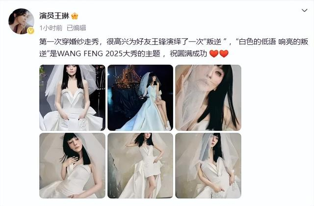 3月30日,王琳在个人社交账号晒出走秀照片,并配文:第一次穿婚纱走秀,很高兴为好友王锋演绎了一次“叛逆 ” ,“白色的低语 响亮的叛逆”是WANG FENG 2025大秀的主题 ,祝圆满成功。