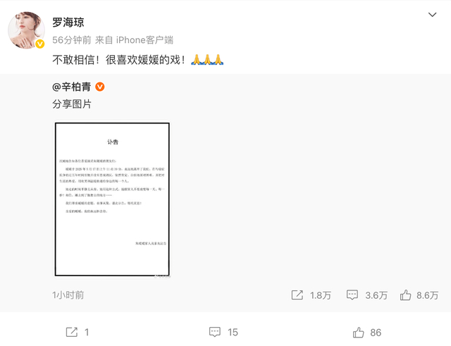 冯远征转发辛柏青微博:“柏青节哀” ↓