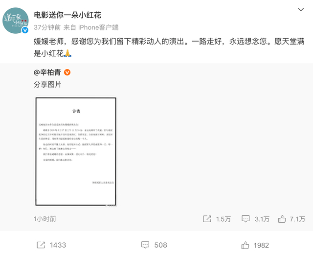@ 电影送你一朵小红花 :“媛媛老师,感谢您为我们留下精彩动人的演出。一路走好,永远想念您。”↓