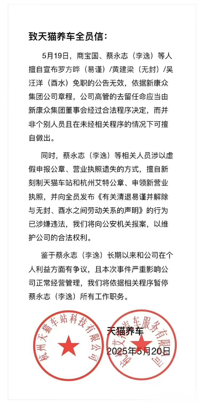 内部信提到,蔡永志(李逸)等相关人员涉以虚假申报公章、营业执照遗失的方式,擅自新刻制天猫车站和杭州艾特公章、申领新营业执照,并向全员发布《有天清运易谨并解除与无封、酉水之间劳动关系的声明》的行为已涉嫌违法,天猫养车已向公安机关报案。