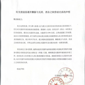 5月19日,网传江苏康众汽配有限公司发布一则声明称,解除罗方晔(易谨)、黄建梁(无封)、吴汪洋(酉水)的劳动关系,并终止他们在天猫养车及相关企业的职务权限。声明表示上述三人擅自以天猫养车总裁、CPO自居,已构成超越工作权限。声明强调相关人员已与公司不存在劳动关系。
