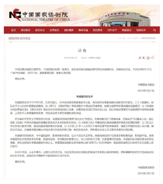 中国国家话剧院一级演员,深受全国观众喜爱的著名演员朱媛媛同志,因病医治无效,于2025年5月17日11时39分病逝,享年51岁。遵照家属意愿,丧事从简办理。