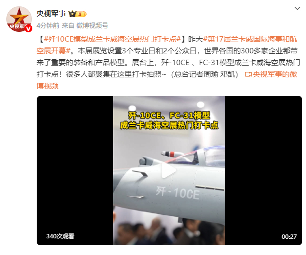 昨天第17届兰卡威国际海事和航空展开幕。本届展览设置3个专业日和2个公众日,世界各国的300多家企业都带来了重要的装备和产品模型。展台上,歼-10CE 、FC-31模型成兰卡威海空展热门打卡点!很多人都聚集在这里打卡拍照~(总台记者周瑜 邓凯)