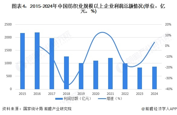 从中国纺织行业利润总额上看,2015-2023年,我国纺织业规模以上企业利润总额整体呈下滑趋势,反映行业盈利能力减弱;国家统计局披露数据显示,2024年,中国纺织业规模以上企业(不包括服装业和化纤业)利润总额达868.7亿元,同比增长3.5%,在2022-2023连续两年下滑背景下出现回升。