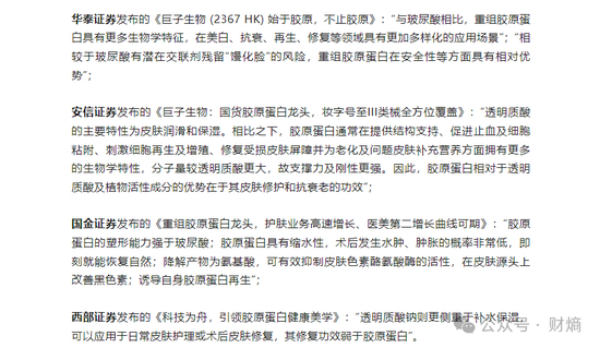 记者注意到,华熙生物在上述文章中直接列举了华泰证券、安信证券、国金证券等9家券商所发的研报。这些研报有的提到玻尿酸与重组胶原蛋白之间的差异,大都涉及重组胶原蛋白、巨子生物有关的内容。比如华泰证券相关研报称:“相较于玻尿酸有潜在交联剂残留‘馒化脸’的风险,重组胶原蛋白在安全性等方面具有相对优势。”