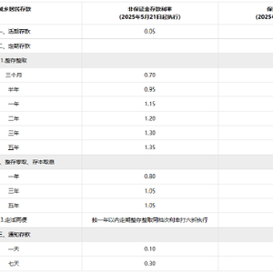 5月21日金融一线消息,中信银行下调存款利率。中信银行官网信息显示,该行于5月21日执行最新的人民币存款利率。其中,活期利率下调5个基点至0.05%。定期存款方面,整存整取三个月期、半年期、一年期、二年期分别下调至0.70%、0.95%、1.15%、1.20%,三年期、五年期下调至1.3%、1.35%。