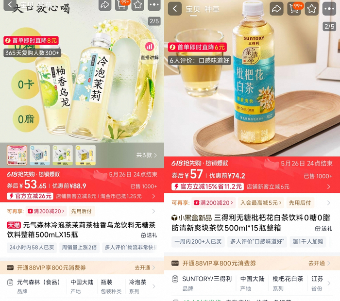 记者注意到,今年3月以来,包括东方树叶、三得利、康师傅、东鹏、茶小开等多个品牌的无糖茶产品都开展了促销活动。