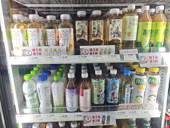在广州市越秀区某家7-11便利店内,短短的三层茶饮料货架内,挂了7个“加1元多1瓶”的活动标签,其中涵盖果子熟了、淳茶舍等多个品牌的茶饮料。