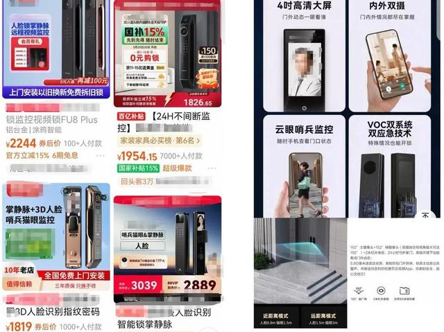 172°高清广角、智能AI人形侦测录像、24小时守护安全……在济南某家具商城的智能家居专区,智能门锁的监控功能被包装成“安全感刚需”。
