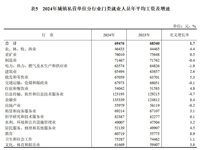 从城镇非私营单位来看,平均工资最低的为住宿和餐饮业,平均工资仅为60240元,倒数第二低是农、林、牧、渔业,平均工资为67475元,倒数第三低是居民服务、修理和其他服务业,平均工资为68159元。