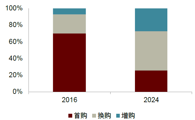 置换需求成为车市新动能。2018年,在经历连续28年增长后,我国汽车销量见顶回落,标志国内车市从增量时代步入存量时代。国内汽车消费结构随之发生变迁,近年来国内首购需求占比逐步下降,从2016年70%降低至2024年25%,增换购需求占比逐步提升。伴随国内车市整体车龄抬升,越来越多车主进入换车周期,置换更新接力成为车市增长的驱动力。