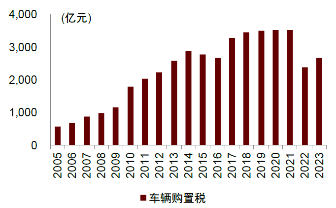 我国对汽车行业征税主要集中在流通环节,如增值税、消费税、车辆购置税、关税(进口车),影响消费者的购车成本;对使用环节征税较少,如车船税、燃油税,影响消费者的拥车成本。从纳税金额看,车辆购置税的贡献最大,2023年达到2681亿元。