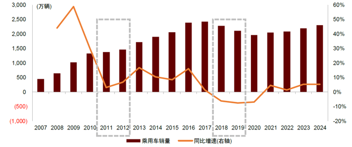 政策退出后产生一定程度透支效应。两轮购置税减征政策显著刺激车市需求的同时,部分购车需求前置实现,政策退出后带来一定程度需求波动。结合数据看,2009/2010年国内乘用车销量增速高达53%/33%,政策退出后2011/2012年销量增速仅5%/7%;伴随市场基数逐步提高,2015-2017年国内乘用车销量保持增长,增速分别为8%/16%/1%,此后销量见顶回落,连续三年持续下滑。汽车作为家庭大宗消费品,耐用品属性更强,购买决策更加谨慎,其需求波动受到政策影响较大,2011-2012年和2018-2019年期间,汽车类零售额增速回落较家电和社零整体更加明显。