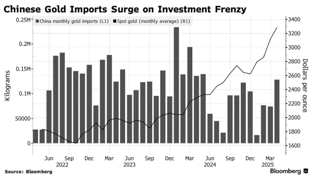 此前,周二公布的中国海关数据显示,中国上月黄金进口总量达到了127.5吨,创下11个月以来的新高。尽管4月金价屡创新高,一度触及每盎司3500美元,但这一进口数字仍较3月猛增了73%。