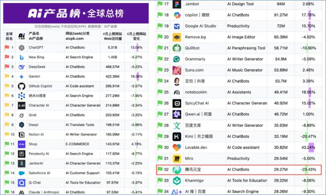 因此,除了用AI赋能,腾讯还要持续打造王牌游戏和应用。游戏前面已经提到了,通过自研+代理+投资模式积累技术来打造爆款,但出现下一个《王者荣耀》可能还需要运气;AI应用元宝在第一季度集成DeepSeek后加大投流并集成到微信中,但后劲不足,目前在AI产品榜网页端4月排名仅为全球第32、国内第7,均落后于DeepSeek、豆包及通义。