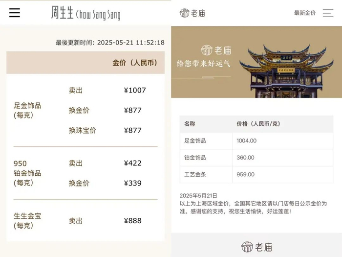受国际金价反弹影响,国内黄金饰品价格再度攀升。据中新经纬报道,5月21日,周生生、老庙黄金等品牌足金饰品报价突破1000元/克,周生生足金饰品报价为1007元/克,相比前日982元每克上涨25元;老庙黄金足金饰品报价为1004元/克,相比前日977元每克上涨27元,一夜大涨近30元。