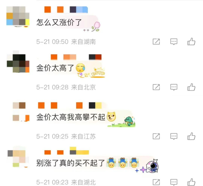 金价持续攀升引发广泛讨论。社交平台上,网友评论称“怎么又涨价了”“金价太高我高攀不起”“希望跌一点吧,真的买不起了”,反映出消费者对价格波动的关注。