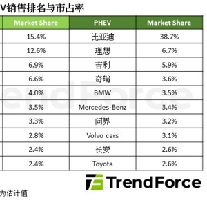 插电混合式电动车市场方面,比亚迪市占率约38.7%居首。吉利受惠于吉利银河车系呈现季增61%、年增158%,排名首次来到第三名。然而,部分中国品牌也出现销量成长幅度缩减或下滑,如问界排名第七名,但销量相较去年同期下跌47%。问界作为华为鸿蒙智行方案中的主力车型,主打华为的辅助驾驶系统,但在华为与多家车厂接连推出智界、享界、尊界车型后,问界的独特性随之降低。深蓝和领克则掉出前十名,领克销量年下降约25%。