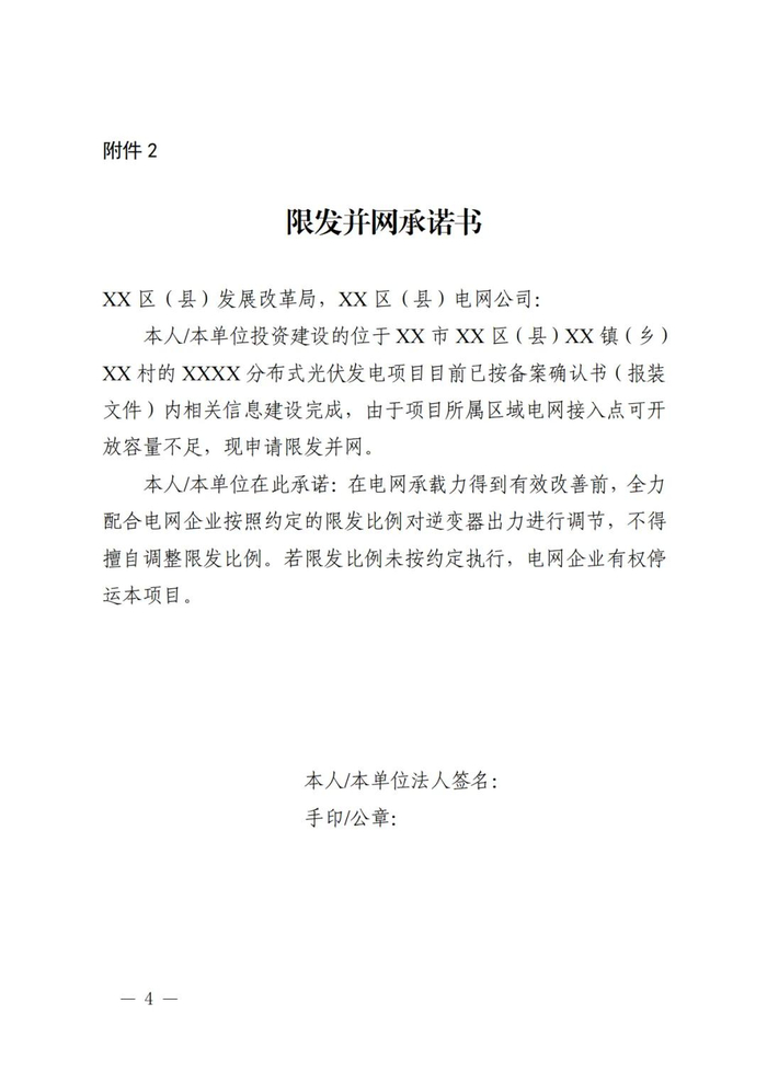 5月23日前,项目投资主体应与属地区县发展改革局签订限发并网承诺书(附件2)。5月31日前,国网陕西省电力有限公司依据陕西省发展改革委提供的项目清单,协同项目投资主体完成限发并网工作。具体限发比例应结合电网承载力现状,由各区县发展改革局与属地供电公司协商确定。