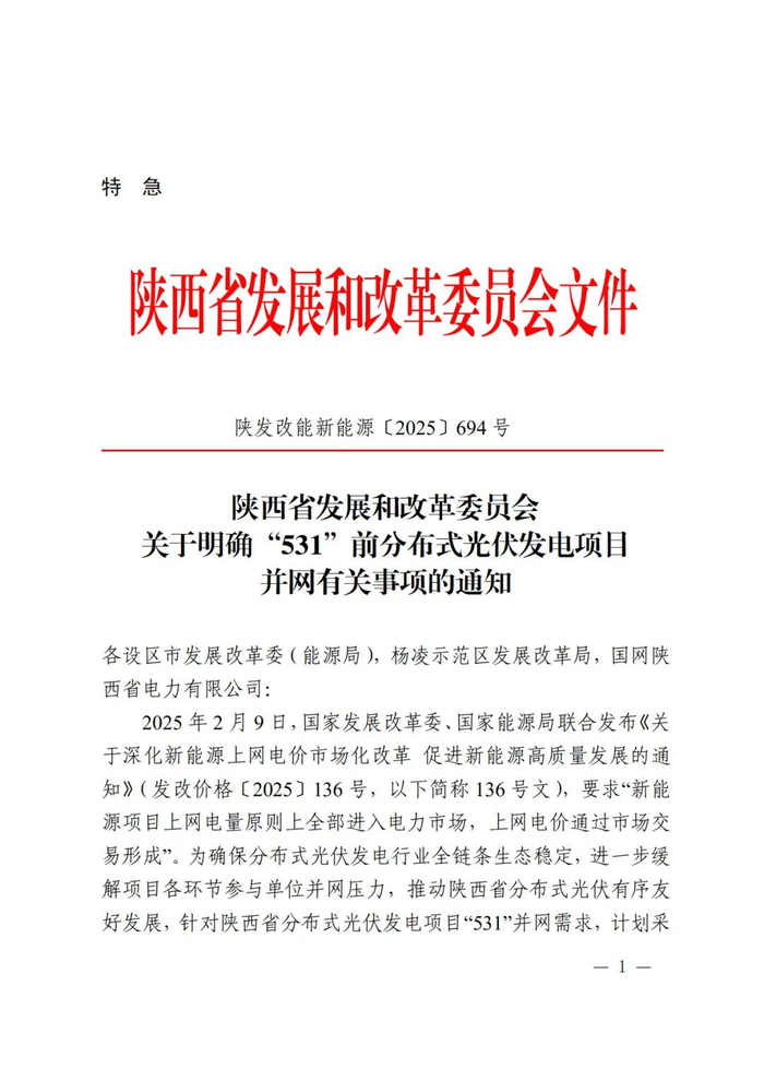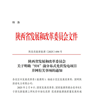 5月20日,陕西省发展和改革委员会发布《关于明确“531”前分布式光伏发电项目并网有关事项的通知》。