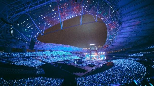 音乐呈现上,周深延续了“声音+情绪”的双线叙事。除《若梦》《化身孤岛的鲸》等经典作品引发全场合唱外,首次亮相的戏腔新作《云裳羽衣曲》成为最大亮点。这首融合传统戏曲元素与现代编曲的作品,在周深层次分明的演绎下化作流动的视觉长卷,万人合唱的震撼场面瞬间引爆社交媒体。演出中段,他以自弹自唱形式演绎新歌《嗨!人间》,极简钢琴编曲与真挚歌声直抵人心,而《好运来》的回归更将现场情绪推向高潮,承载着祝福的旋律在万人挥舞的荧光棒中闪耀。