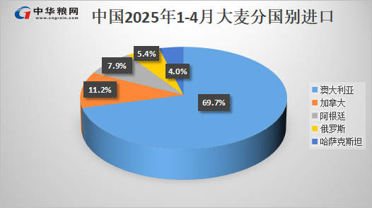 1-4月小麦进口量总计为101万吨,同比减少约83%。进口来源国主要有:从加拿大进口59.5万吨,占比59%;从澳大利亚进口39.6万吨,占比39%;俄罗斯进口1.03万吨,占比1%;哈萨克斯坦居第四位进口9602吨,占比约1%。
