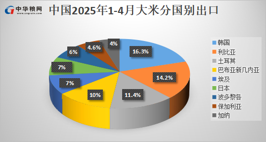 1-4月,我国稻米累计出口量35万吨。其中,向韩国出口5.7万吨,占比16.3%;向利比亚出口5万吨,占比14.2%。