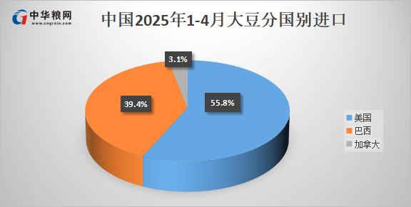 1-4月累计进口大豆2319万吨,同比减少14.6%。其中从美国进口1294.6万吨,占比55.8%;巴西进口914万吨,占比39.4%;加拿大进口71万吨,占比3.1%。