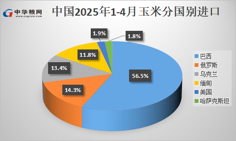 1-4月玉米进口量共计44万吨,同比减少约95%。其中,从巴西进口玉米25万吨,占比56.5%;俄罗斯进口6.3万吨,占比14.3%;乌克兰进口5.9万吨,占比13.4%;缅甸进口5.2万吨,占比11.8%。