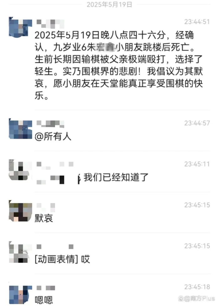 近日,有网友爆料称,“年仅9岁已达到业余6段的围棋手小朱(化名),在受到父亲家暴后坠楼。”同时在多个微信群内,有网友发布消息称,“5月19日晚八点四十六分,经确认:九岁业6(业余6段)小朋友跳楼后死亡。生前长期因输棋被父亲极端殴打,选择了轻生。”
