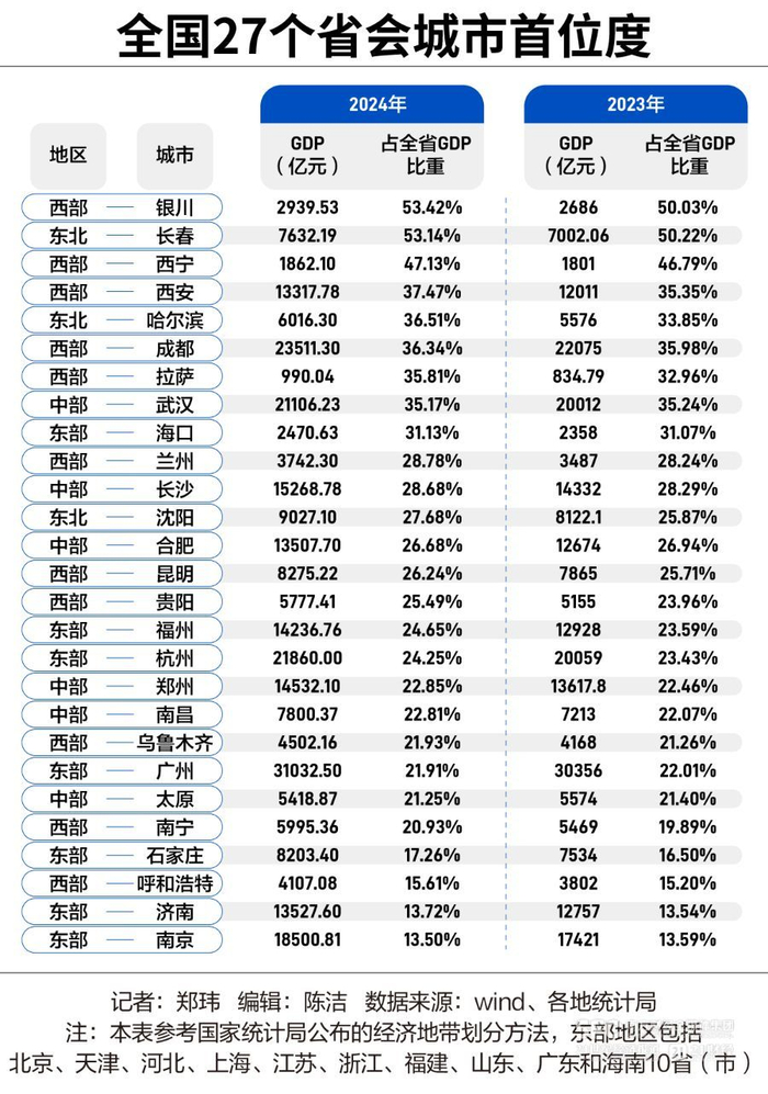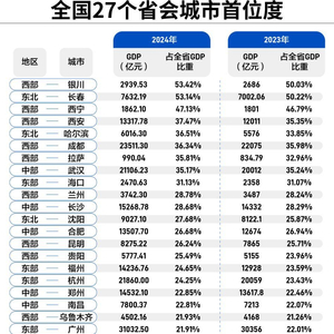 2024年,我国27个省会(首府)的首位度(即省会GDP占全省的比重)出炉,东部省份的省会城市呈现出明显的特征。