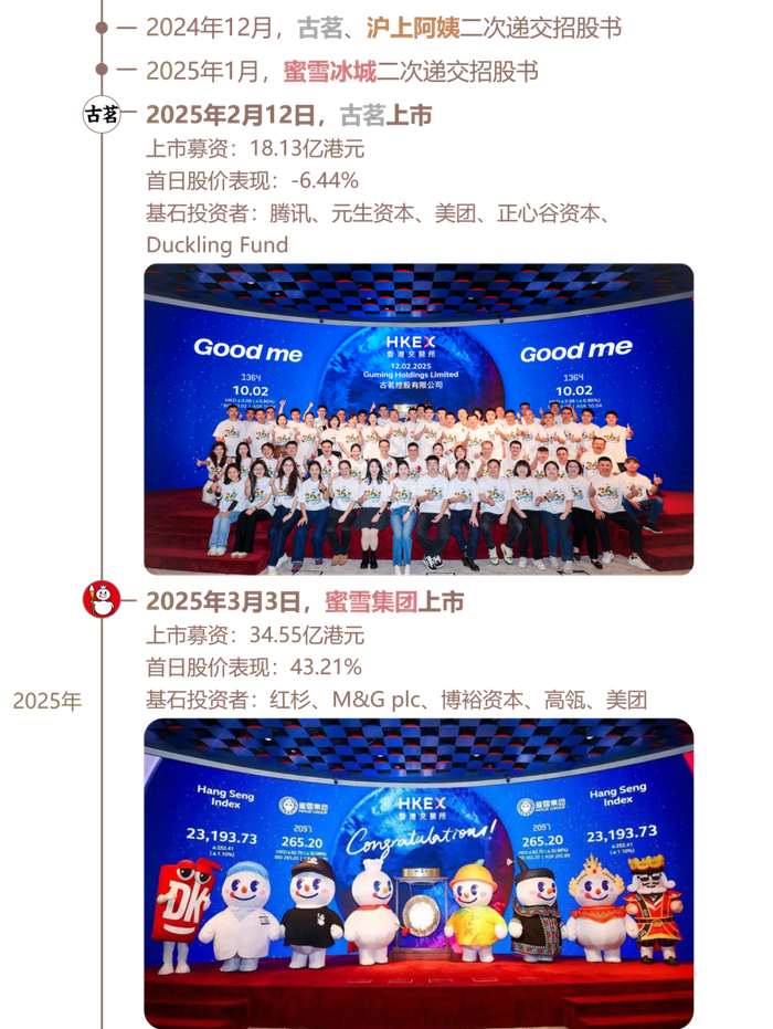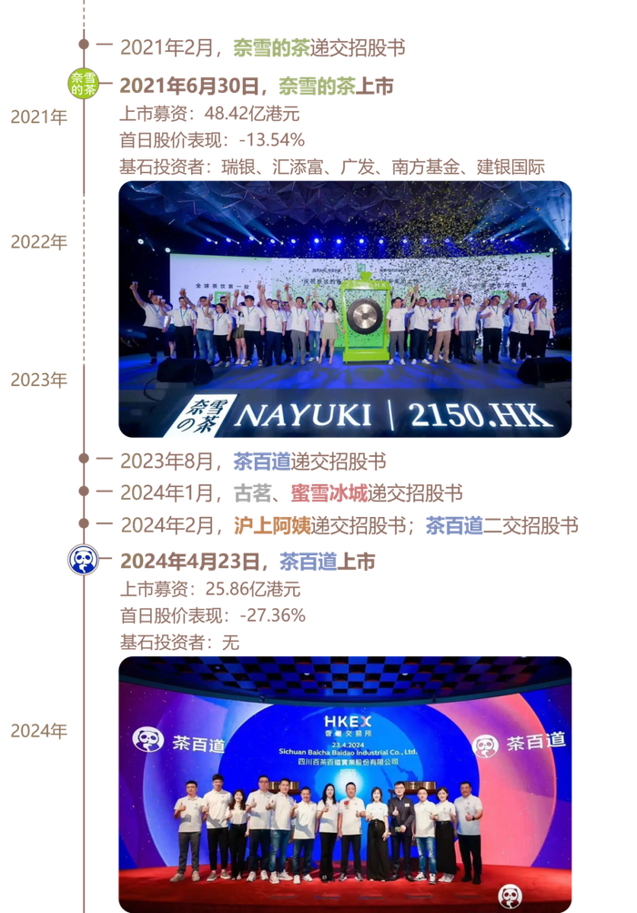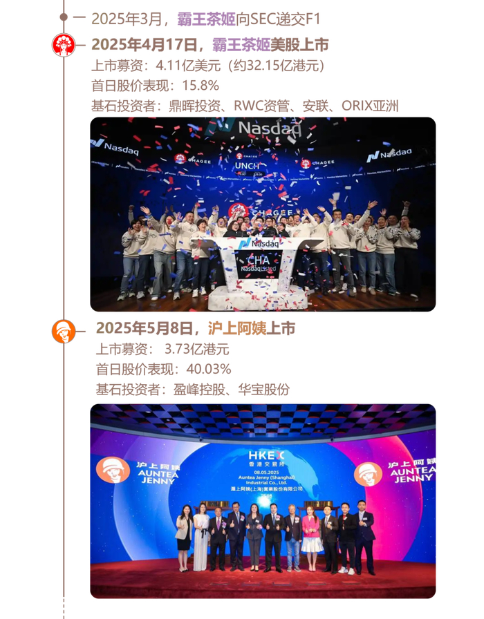 2021年6月,奈雪的茶率先破冰,夺魁“全球茶饮第一股”;2024年4月,茶百道上市刷新年内港股最大市值IPO记录;2025年2月,腾讯、美团以基石身份背书古茗上市;同年3月,蜜雪集团创港股历史融资认购新纪录;4月,霸王茶姬成为“首家美股上市的中国新茶饮品牌”;5月,沪上阿姨首日开盘报价创港股新茶饮板块首日涨幅纪录。