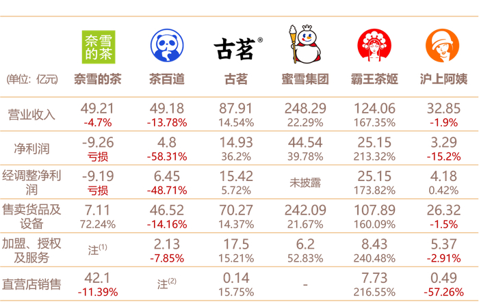 注释(2):未直接披露,年报内合并为“其他”项,包括加盟门店设计服务收入;外卖平台的在线运营及管理服务收入;茶百道直营店收入。