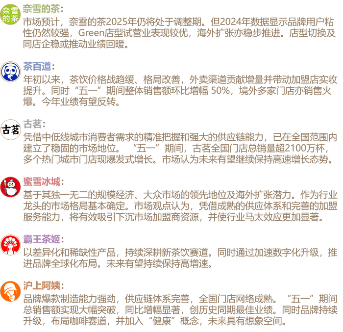 2024年,营收利润最多的上市茶饮品牌为蜜雪集团;增速最快的为霸王茶姬。同时,奈雪的茶由盈转亏,陷入深度调整期;茶百道和沪上阿姨亦面临不同程度的业绩减速和调整。