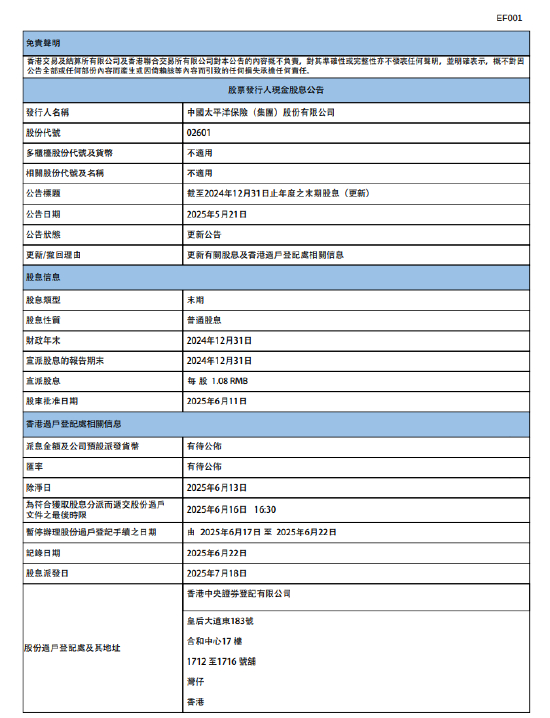 中国太保:将于7月18日派发末期股息每股1.08元 金融一线 2025.05.2121:11 关注 5月21日金融一线消息,中国太保发布公告,将于2025年7月18日派发截至2024年12月31日止年度的末期股息每股1.08元。