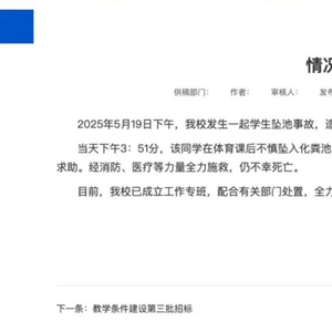 当天下午3时51分,该同学在体育课后不慎坠入化粪池,同行同学施救未果后向老师报告。学校立即投入救援并报警求助。经消防、医疗等力量全力施救,仍不幸死亡。目前,该校已成立工作专班,配合有关部门处置,全力做好善后事宜,并加强风险排查,确保校园安全。