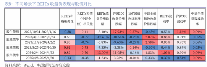 2)在股熊债牛的区间内(2023/4/18-2023/8/24、2023/11/28-2024/2/2),股指下跌约10%,十债收益率下行约27BP,中债全价指数上涨在2.6-2.9%左右,此时REITs和股指共同收跌,2023/4/18-2023/8/24区间跌幅(12.61%)甚至超过沪深300;且这一场景下,REITs价格波动幅度相对较高在0.8%,接近股指波动率0.91-0.95%的水平,权益属性明显;2023/4-2023/8以及2023/11-2024/2的股熊债牛场景延续时长约2-4个月。